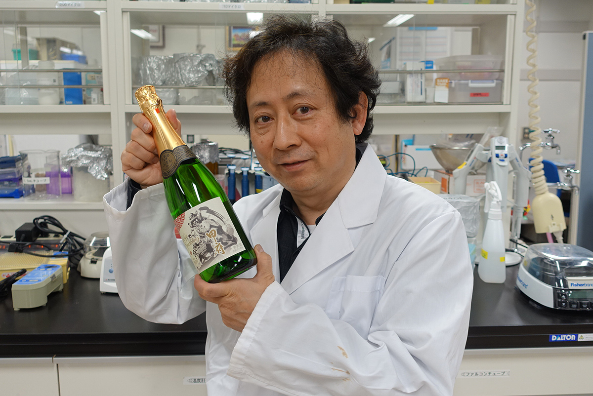 2019年は、武田信玄の父信虎が甲府に住んで500年の記念の年だったので、武田信玄が住んでいた武田神社のお堀の水などを採取し、研究室において発酵性酵母を403株分離。その中から優良な酵母を探索し選抜した発酵性酵母(AU14-22株)を用いて、甲府市産の甲州ブドウを使用したオール甲府市産の白の「甲府スパークリングワイン甲州」を開発しサドヤワイナリーから発売しました。