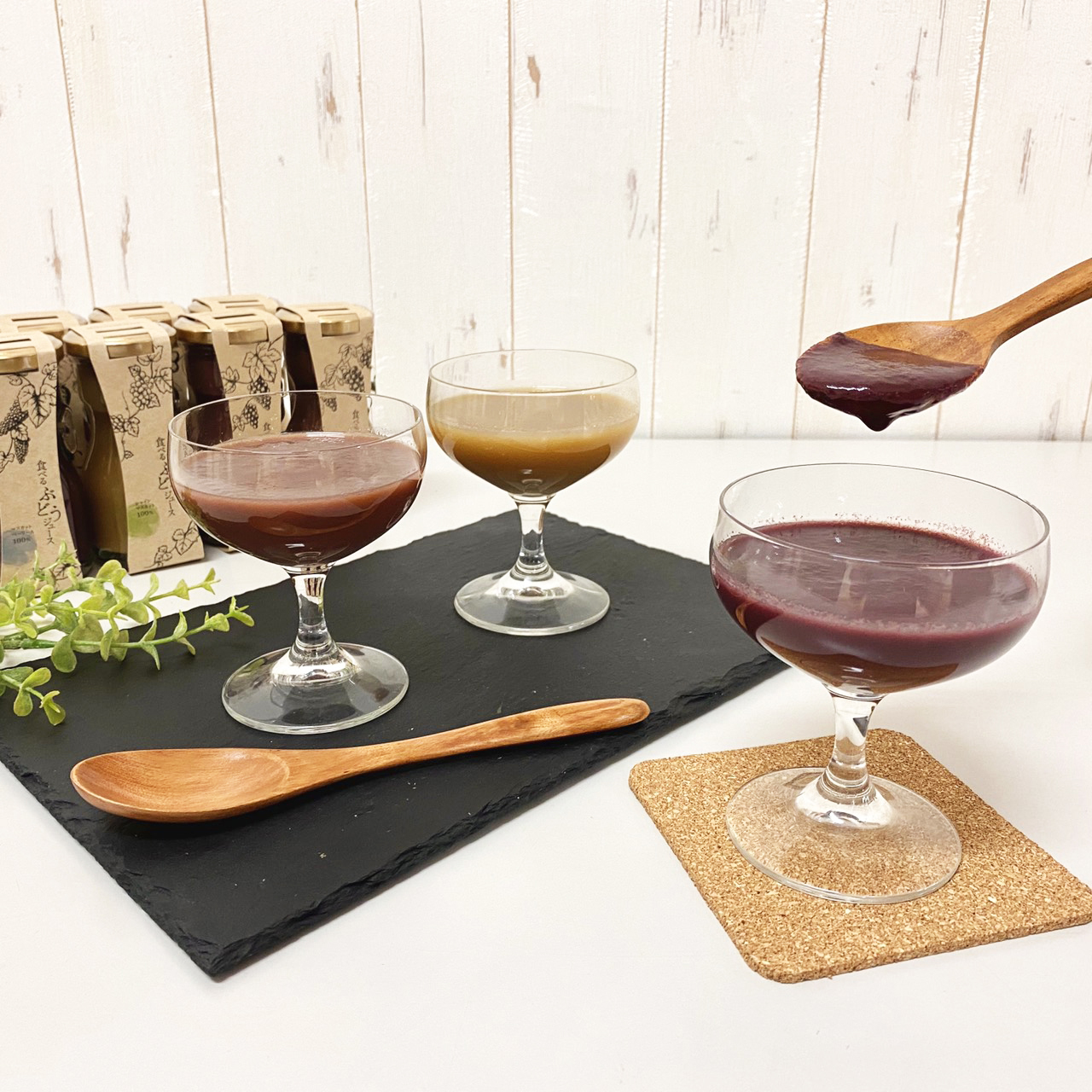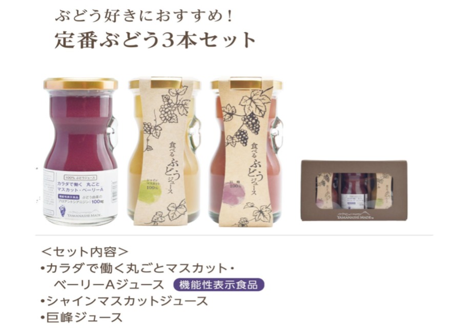 大量生産のラインでは使えない、手間ひまのかかるマスコロライダーという器械を使用して、原料の果物をミクロまで破砕するのがポイント。一般的なぶどうジュースではとれないビタミンEやオレイン酸やリノール酸が含まれています。また、種などに総プロアントシアニジンやレスベラトロールも多く含まれています。添加物を一切使用していないため、安全な商品にもなっています。2020年には、マスカット・ベーリーAでつくった食べるぶどうジュースに含まれるプロアントシアニジンに高血圧を下げる効果があるため、機能性表示食品に認定されました。ぜひ、一度飲んでいただきたい商品です。