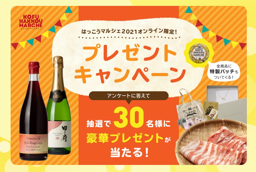 「こうふはっこうマルシェ」のサイトに訪れてくれたお客様の中で、アンケートに答えてくれた方の中から抽選で30名様に、甲府ゆかりのすてきなプレゼントが当たります!