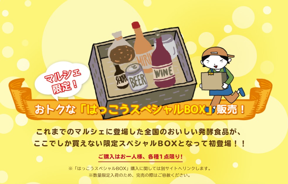 これまでのはっこうマルシェに参加してくれた醸造蔵の発酵食品や調味料、スイーツを集めたスペシャルBOXを今回のために用意しました。