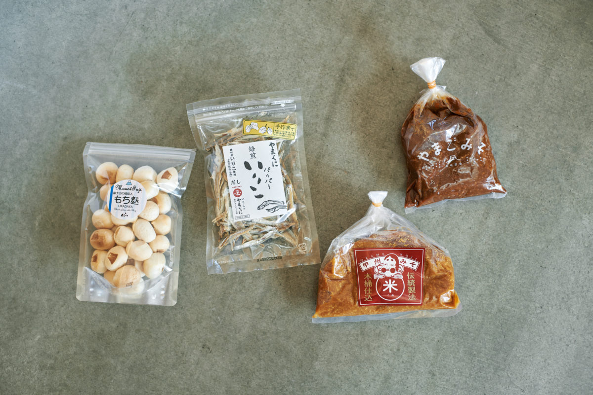 ▲レシピに使用した山梨のおいしいもの。左から、麩の岡田屋「もち麩」、やまくに「パリパリ焙煎いりこ」、おかめ麹「米みそ」、五味醤油「やまごみそ」