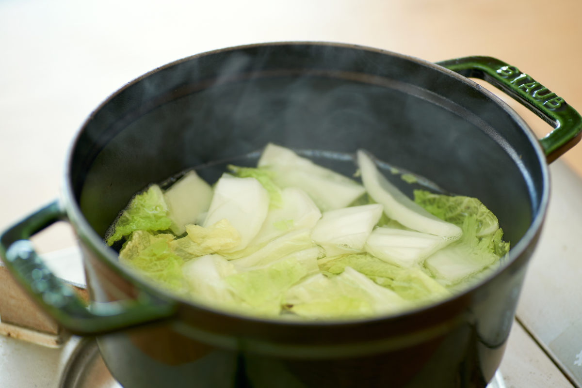• 2.. いりこだしが沸騰したら、白菜、ネギの順に入れる