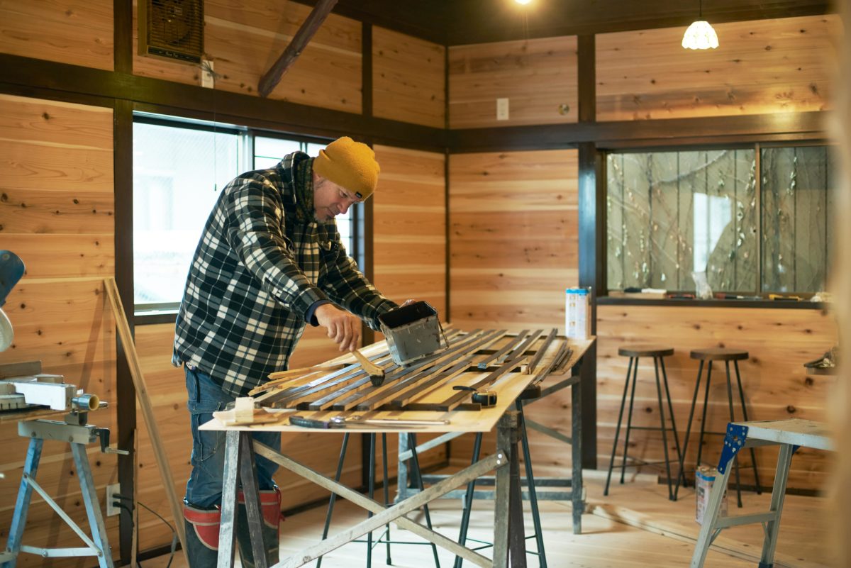 近年、着実にクラフトビールが飲める場所が増えている甲府市内に、この春新たにエールハウスが誕生する予定です。手がけるのは、街の中心から標高差300〜400mの帯那地区でブルワリーを営むデイブさん。この日は店内工事をひと休みして、エールハウスのご近所さんとなるNAP bed and loungeの吉田さんとの対談です。友人同士でもある2人の、甲府の街とクラフトビールについてのおしゃべりが、乾杯から始まります。