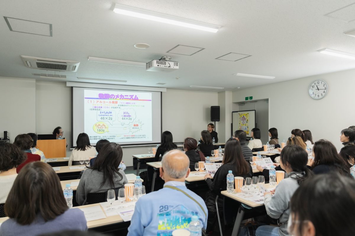 その後、柳田藤寿教授による「甲府のワインと酵母を知る」と題した講演を聞きながら、ワインなどの試飲を行いました。醸造微生物学・微生物分類学を専門分野として研究する柳田教授。現在は発酵食品とワイン醸造の微生物学的研究をテーマとし、乳酸菌や酵母を使った発酵食品の研究を行っています。