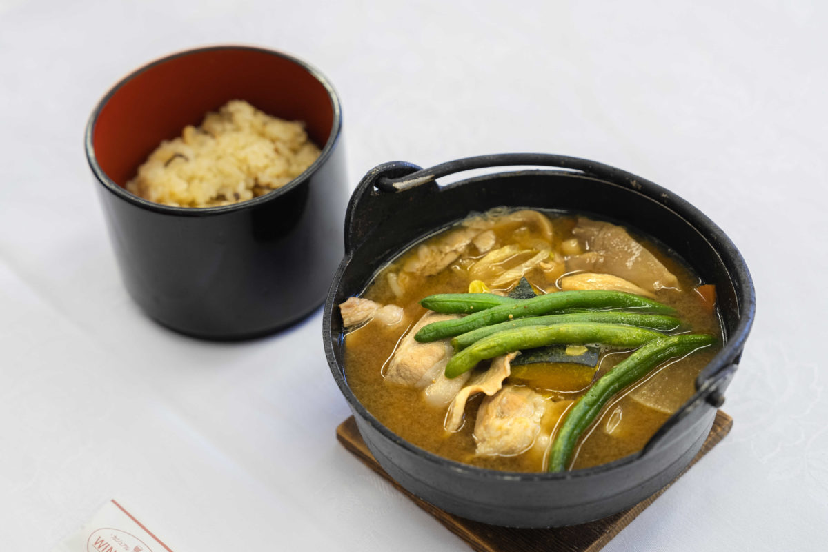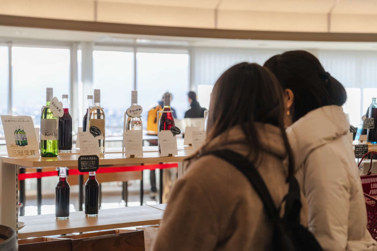 その後昼食会場のかいてらすへ移動。郷土料理のほうとうや鳥もつ煮などを味わい、1階の試飲コーナーで甲府市産や県産のワインを楽しみました。1階では、県内最大級の37社220本のワインのほか、県産の日本酒、一大産地である甲府のジュエリーや甲州印伝などの伝統工芸品、銘菓なども取り揃えているため、お買い物を楽しんでいる方も多くいらっしゃいました。