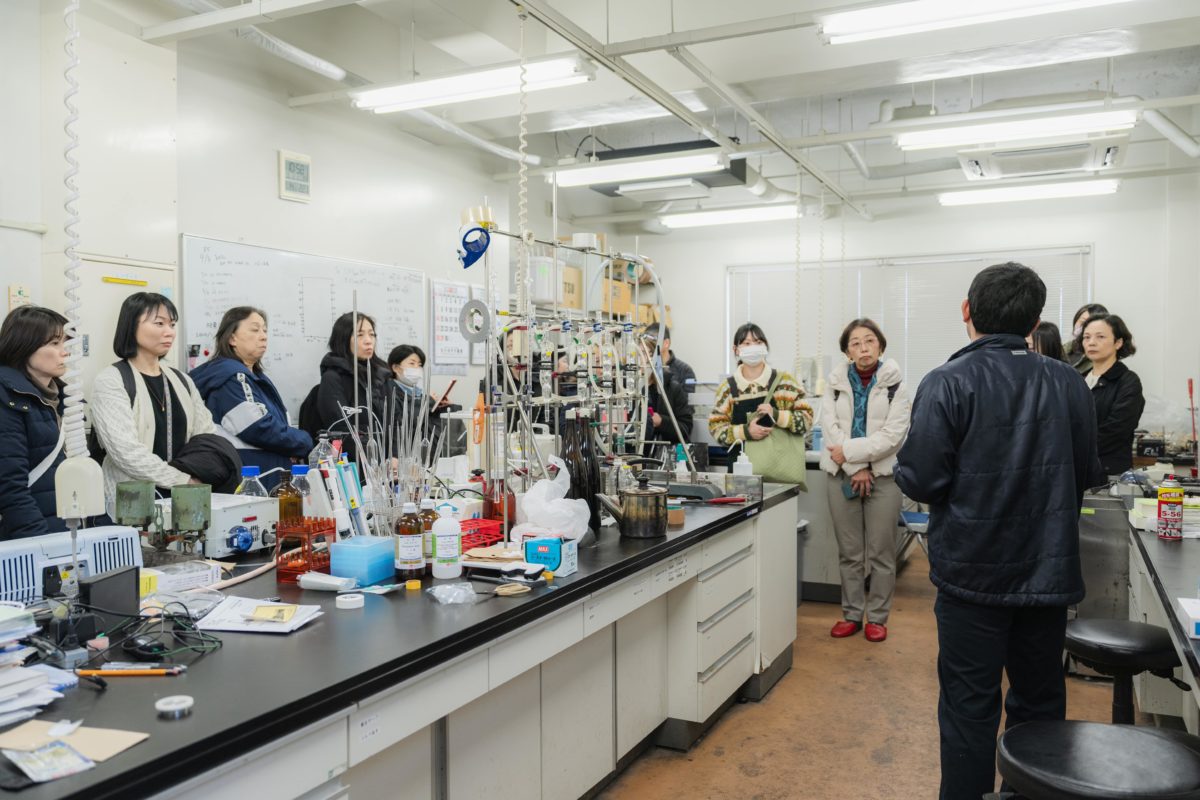 工場で醸造したワインの成分を分析しているという1階の分析室では、担当の方からお話を伺いました。室内には蒸留器具や、ワインの酸度や糖度を計る機械などが並びます。美味しいワインをつくるための発酵管理を一つのテーマにしながら研究を続けている、とのこと。質疑応答の時間では、参加者から様々な質問が飛び交いました。「酵母はどのように見つけてくるのか?」「ワイン酵母としての条件は?」「これまで採取できた酵母で意外なものは?」「酵母によって味わいはどう変わるのか?」「ワインの酵母とチーズの酵母の違いは?」など、ひとつひとつの質問に対して詳しく解説いただき、酵母に対しての知識を深めていきました。